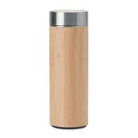 Gourde double paroi Inox avec couvercle isolant en bambou et infuseur à thé. Contenance 400 ml.